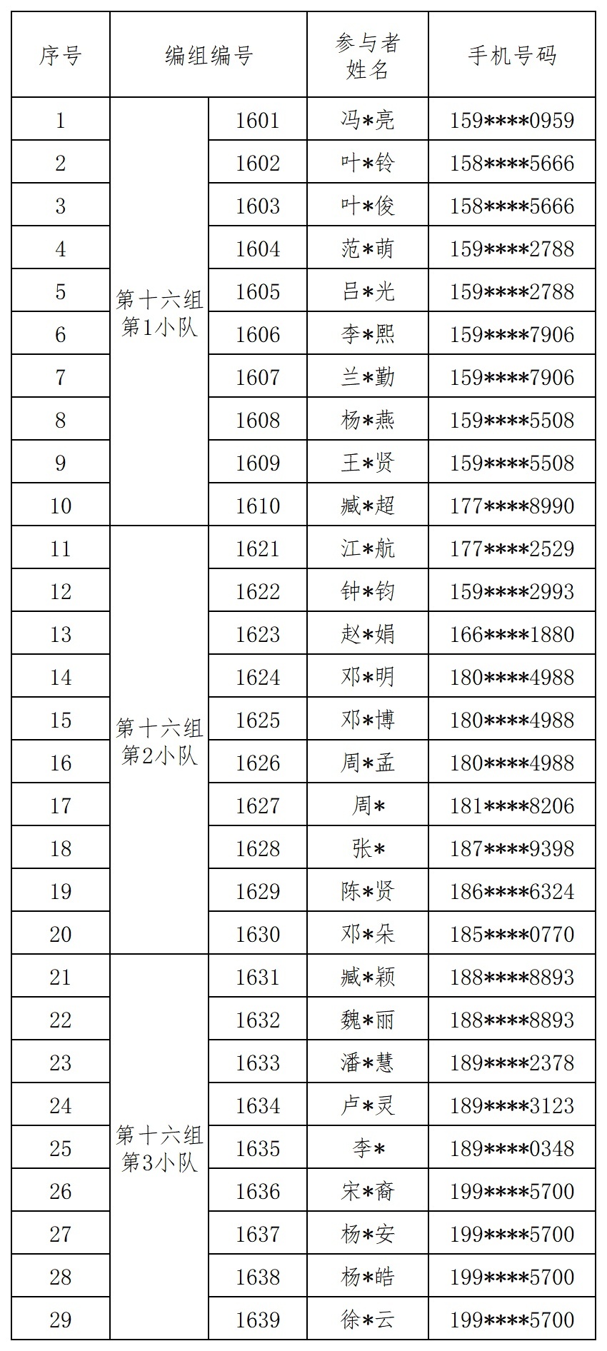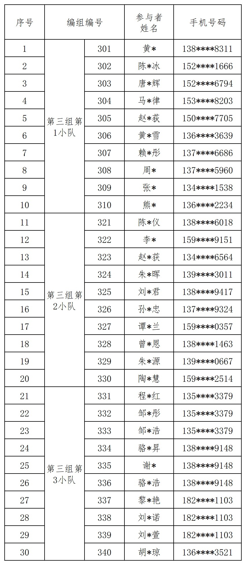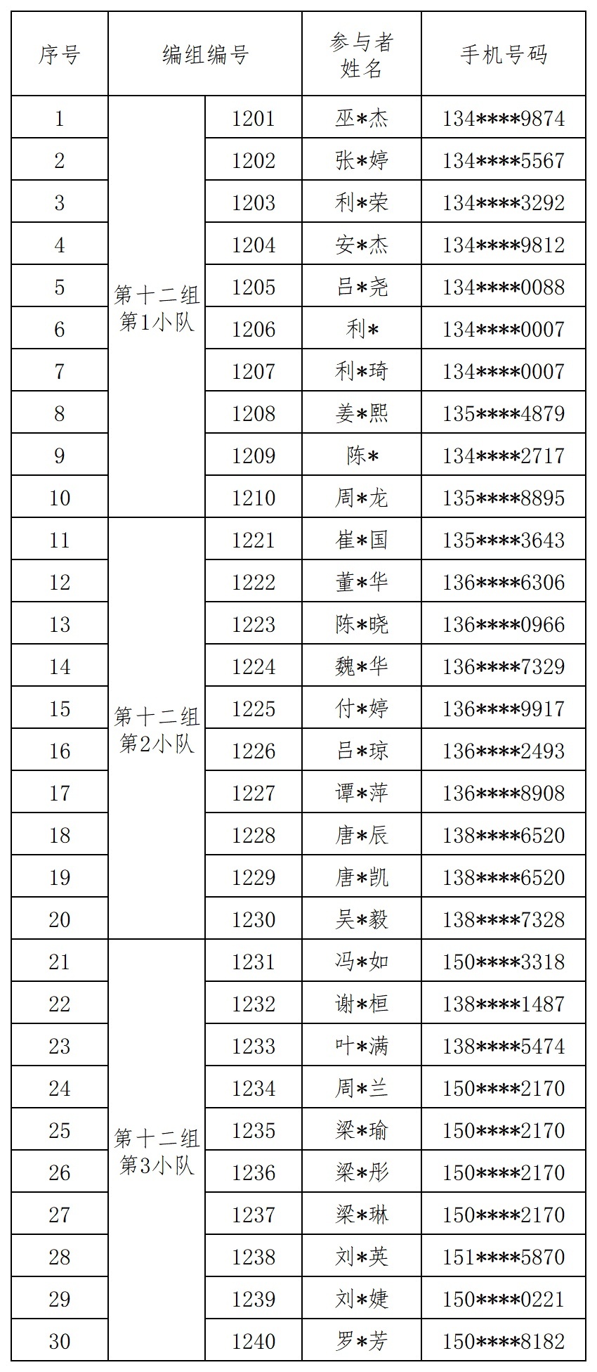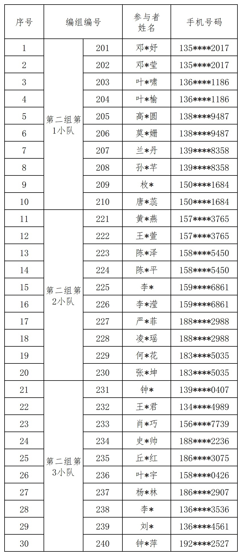 报名成功人员的编组名单