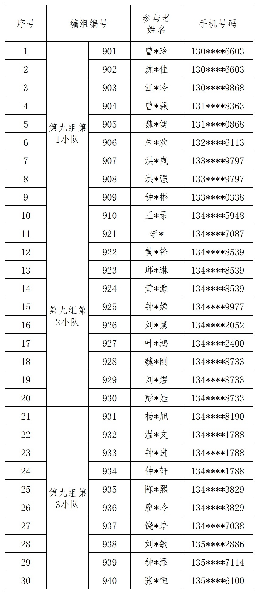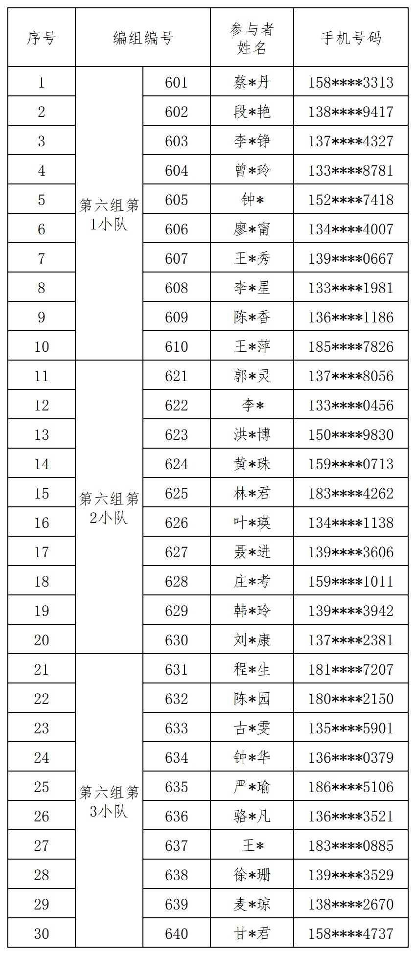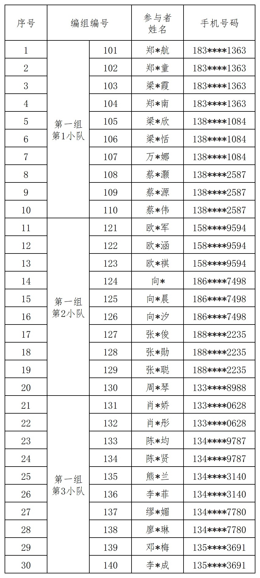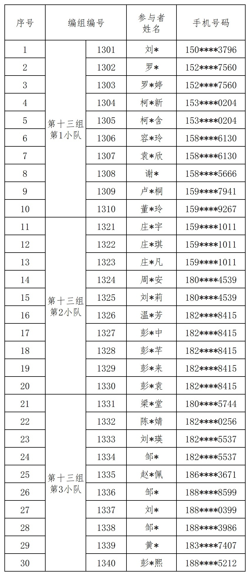 报名成功人员的编组名单