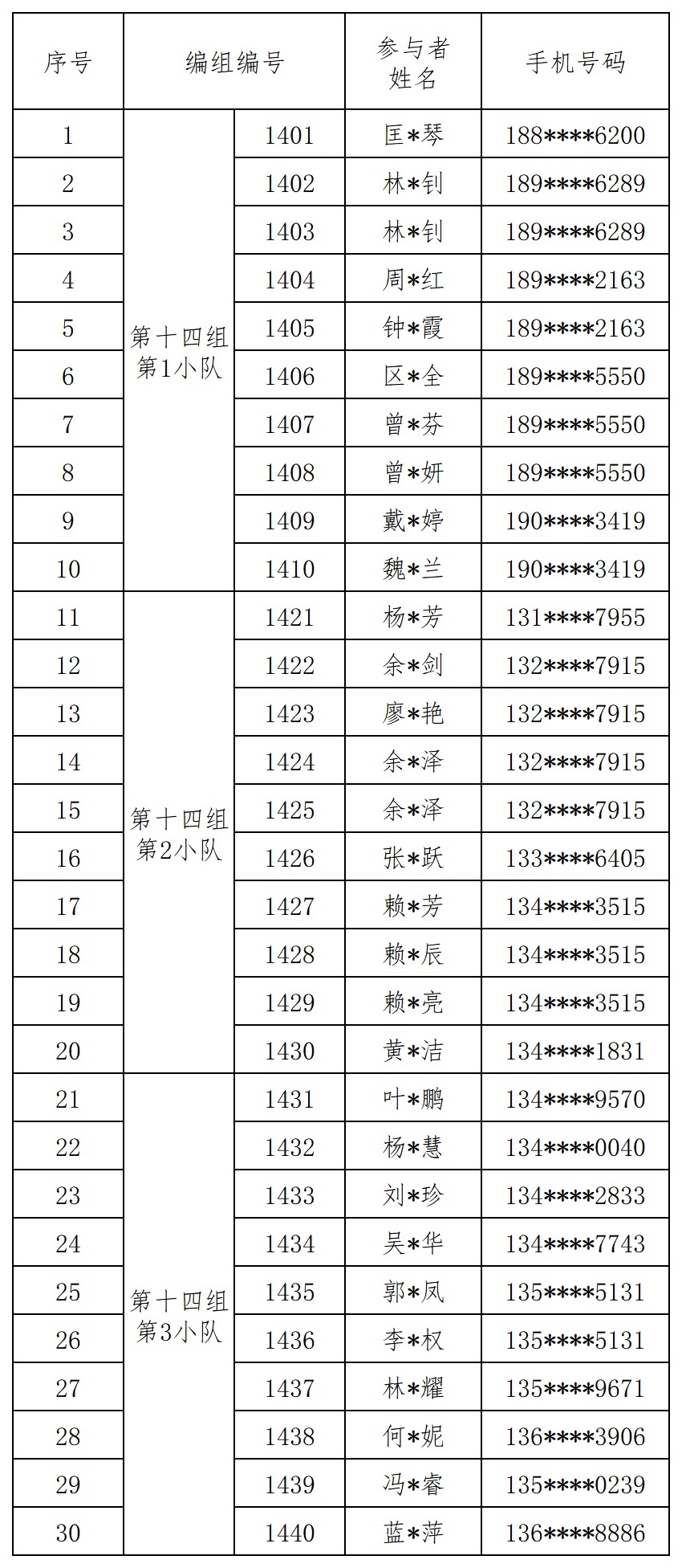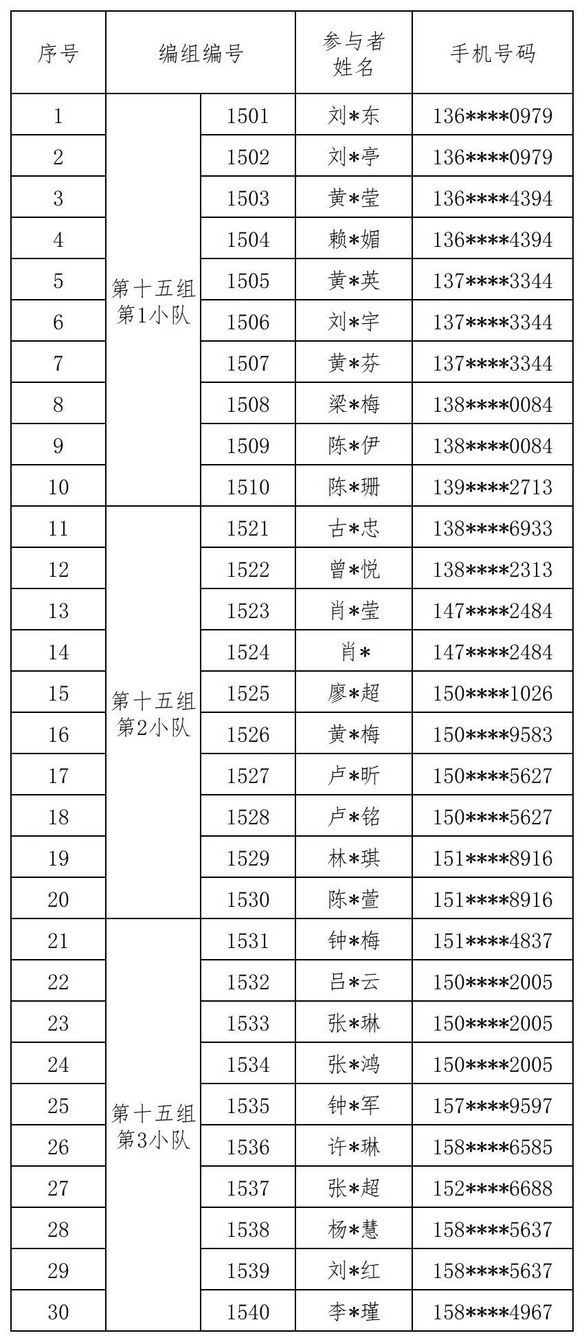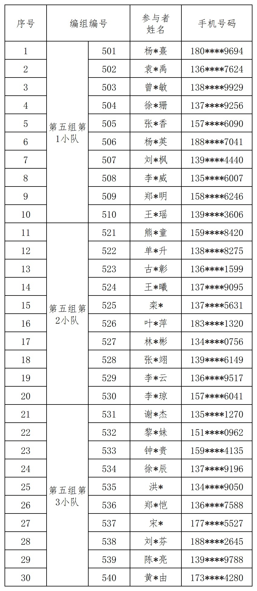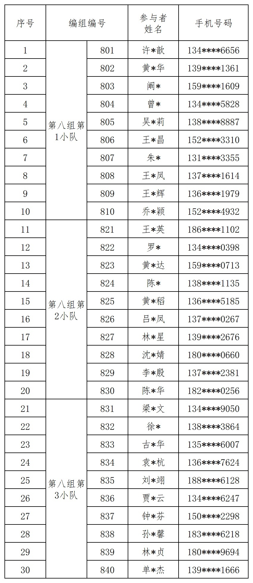 报名成功人员的编组名单