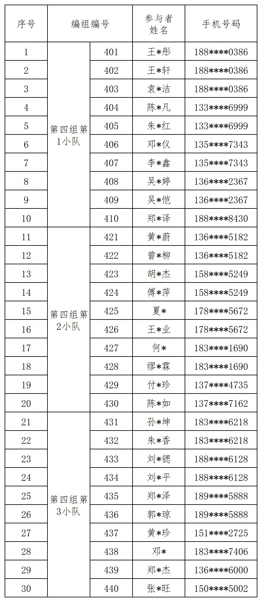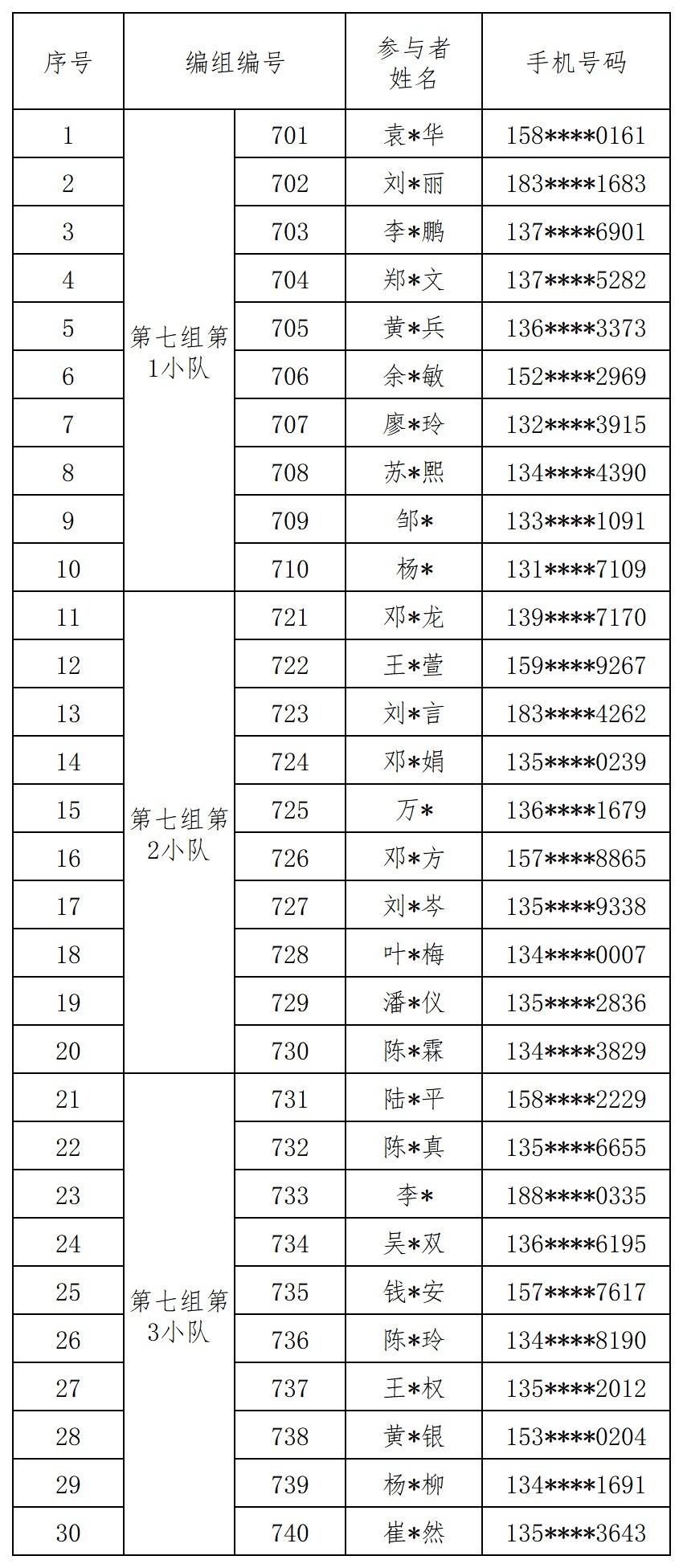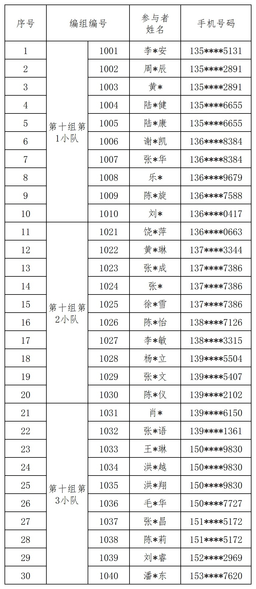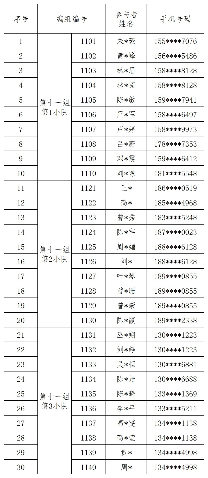 报名成功人员的编组名单