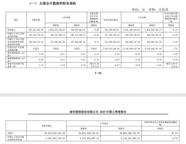中国网财经10月24日讯今日,南华期货(证券代码:603093.SH)发布《2025年第三季度报告》显示,第三季度南华期货实现营收为3.47亿元,同比下降0.98%;净利润为1.2亿元专业配资开户服务,同比下降6.21%。前三季度营收为9.41亿元,同比下降8.27%;净利润为3.51亿元,同比下降1.92%。截至本报告期末,南华期货录得总资产640.79亿元,同比增长31.14%。